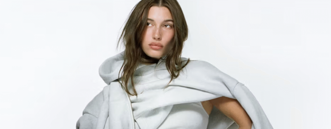 Kolekciju predvodi kožna zip-up jakna boxy kroja, uz prateće dukserice, oba modela sa Haileyinim prepoznatljivim naglašenim ramenima — strukturnim detaljem koji je već diskretno najavljivala kroz recentne street style kombinacije. U strogoj paleti bele, sive i crne, komadi spajaju SKYLRK-ov comfort-first pristup sa oštrijom, gotovo arhitektonskom siluetom, prilagođenom njenoj estetici „sporty romance” sa dozom edgy minimalizma.
